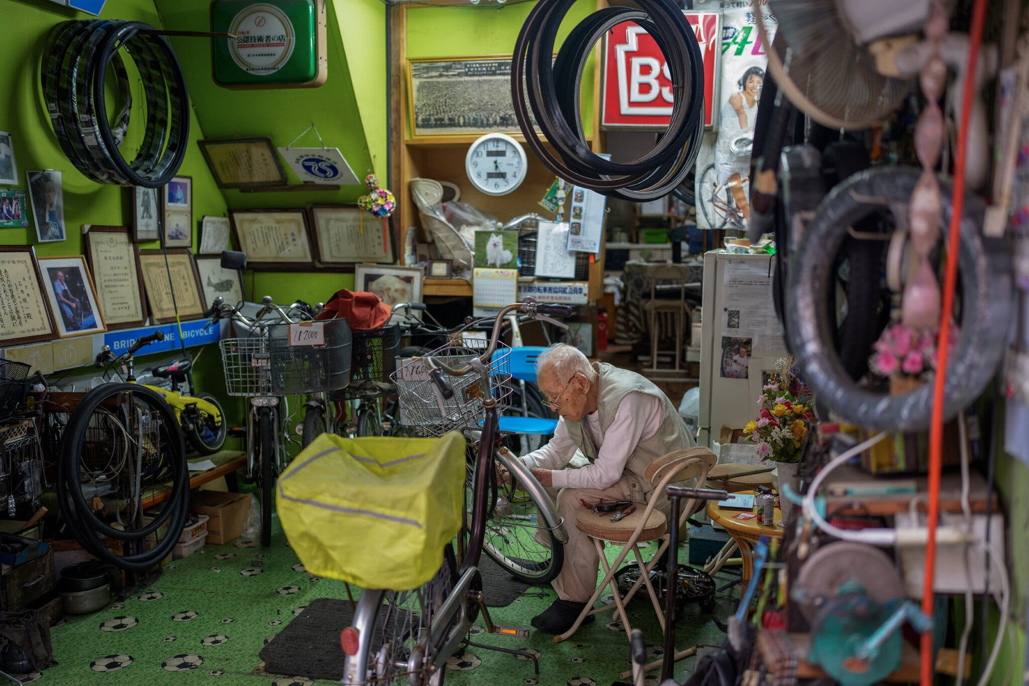 Ông vẫn nhớ rõ những năm tháng sống trong thời chiến, khi chẳng có gì là chắc chắn. Khoản thu nhập từ việc sửa xe giúp ông bù thêm cho khoản lương hưu hằng tháng 50.000 yên (khoảng 330 đô la Mỹ). “Không bao giờ biết được chuyện gì sẽ xảy ra,” ông nói, vừa tự tay nấu súp miso cho một người trong căn bếp nhỏ bừa bộn phía sau cửa tiệm.