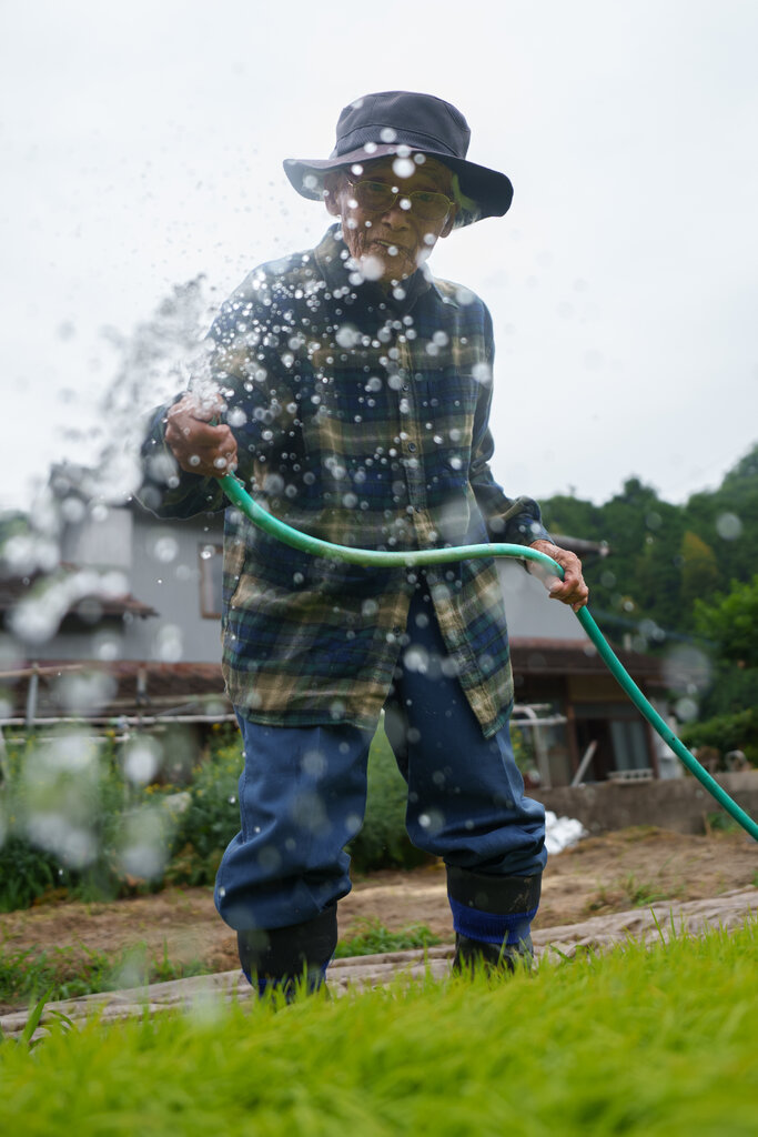 Ông Matsuo, 101 tuổi, vẫn tự tay trồng cà tím, dưa leo và các loại đậu theo từng mùa vụ. “Tôi làm việc để giữ cho mình khỏe mạnh,” ông nói trong một buổi sáng tháng Bảy, vừa kéo chiếc ghế nhựa nhỏ ra giữa ruộng, vừa nhấp ngụm nước giữa những lần nghỉ tay khi tưới mạ non.