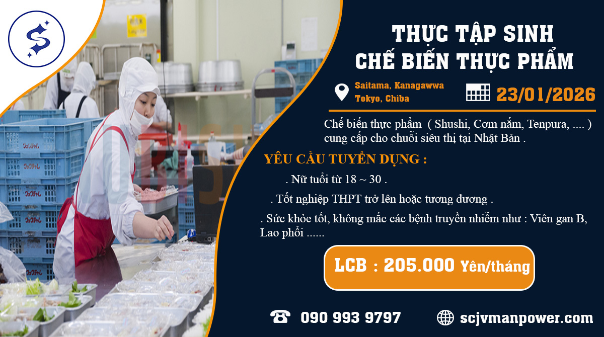 Nội dung công việc: Chế biến thực phẩm ( Shushi, Tempura, Cơm nắm, Sashimi….) cung cấp cho chuỗi siêu thị tại Nhật Bản.